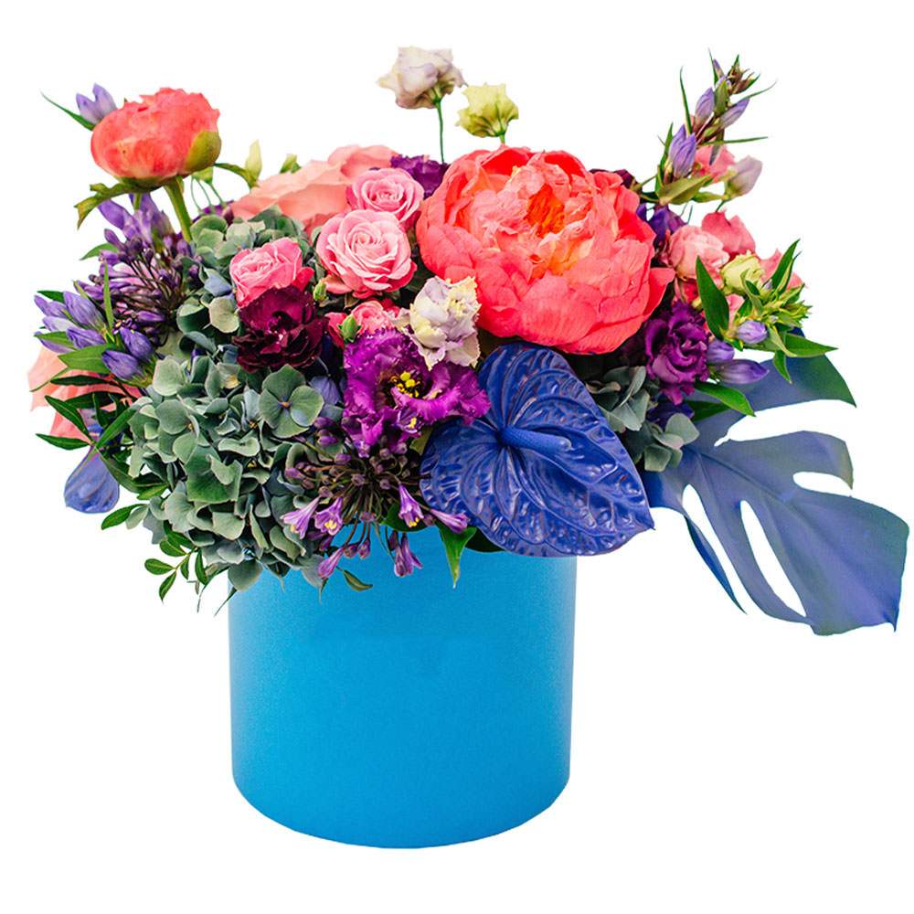 Крашенный антуриум, крашенная монстера, пионы, роза одноголовая, роза кустовая, эустома, гортензия, гвоздика кустовая, аллиум, гентиана.